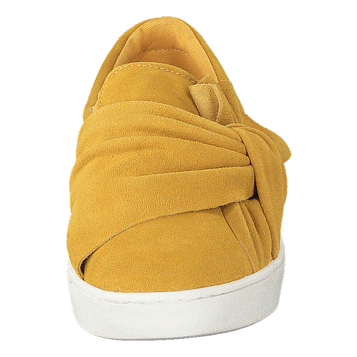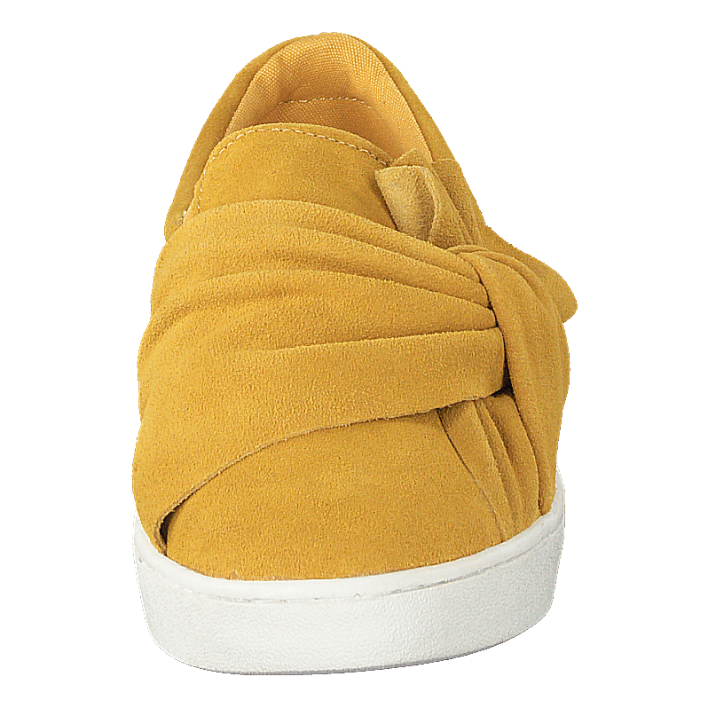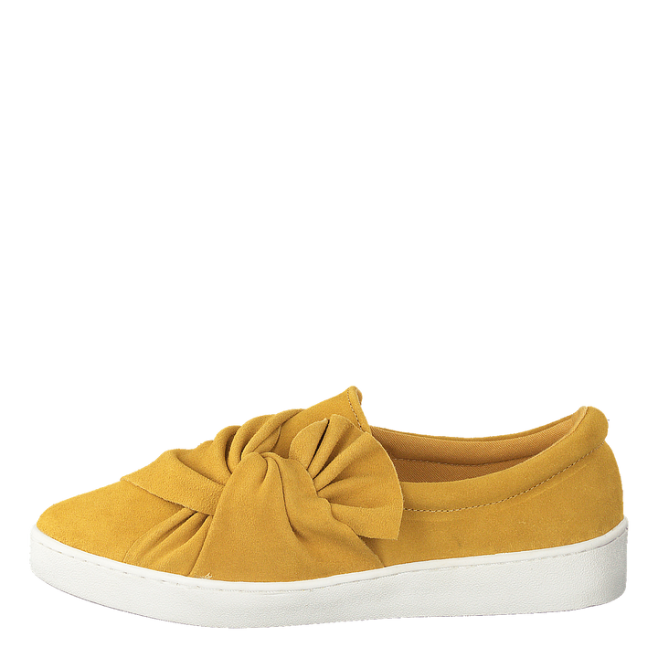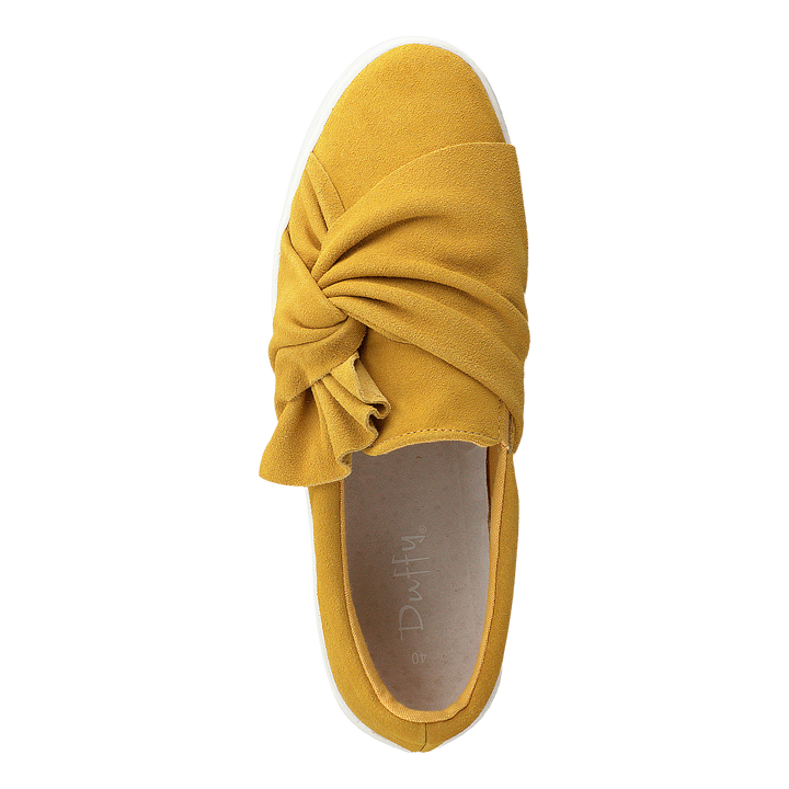 Te płaskie buty o szerokiej szerokości są idealne do noszenia na co dzień. Kolor jest żółty, a materiał to zamsz.