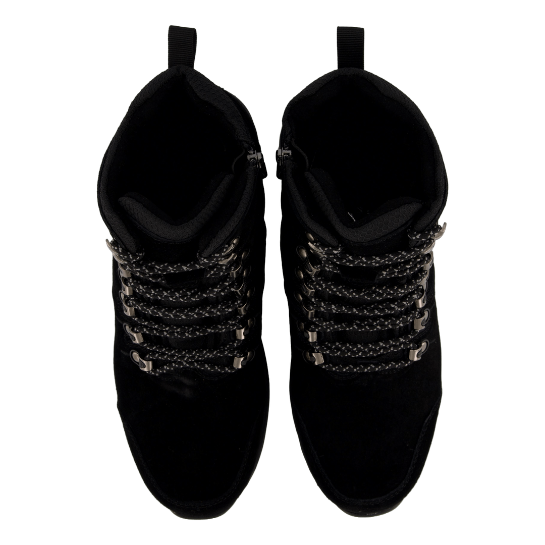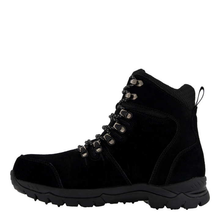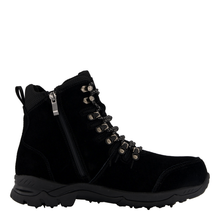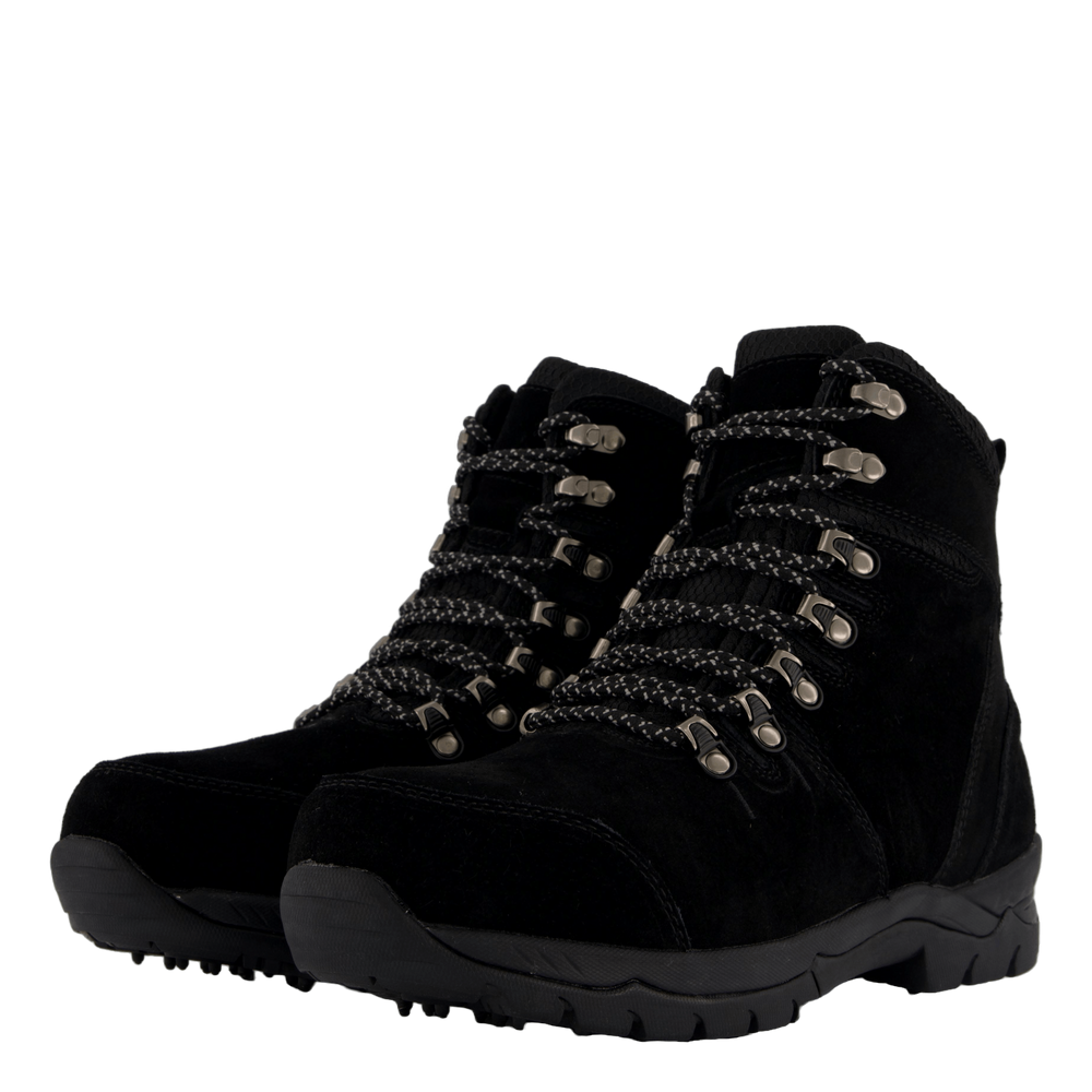 Eskimo škorenj na vezalke na zgornjem delu iz pravega semiša. Ima toplo sintetično podlogo in notranji podplat. Ima dodatno oblazinjenje okoli gležnja in vzdolž jezika za najboljše udobje. Zadrga na notranjem delu gredi za enostavno obuvanje in sezuvanje. Trdne zanke in kavlji za preprosto zavezovanje in prilagajanje čevlja nogi. Podplat ima 16 volframovih čepov in 15 gumijastih čepov. Ti jekleni čepi omogočajo normalno hojo tudi po ledu in brozgi. Po drugi strani pa gumijasti čepi pomagajo, ko obstaja nevarnost zdrsa, na primer na trdih tleh kot v trgovinah.